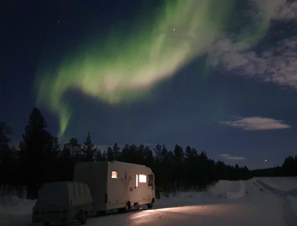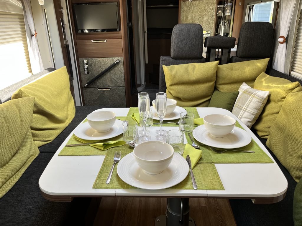 Huippuluokan varustelu: Täysin varusteltu keittiö, tilava kylpyhuone, ilmastointi ja lämmitys – kuin hotellissa, mutta pyörillä.